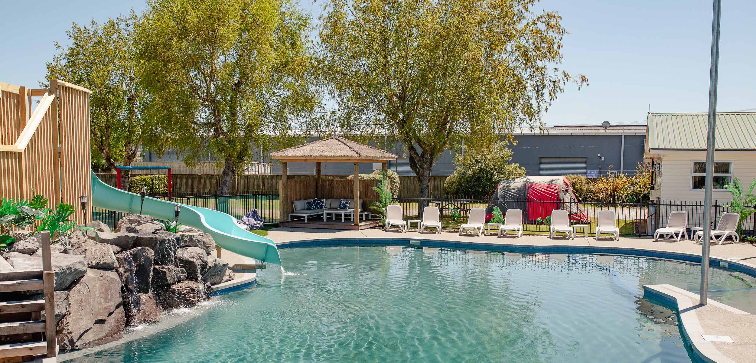 Swim in our pool in our summer months (24 to 29 degrees between Labour Weekend – Anzac Weekend) complete with a Manu rock and the new “Ricochet” slide.