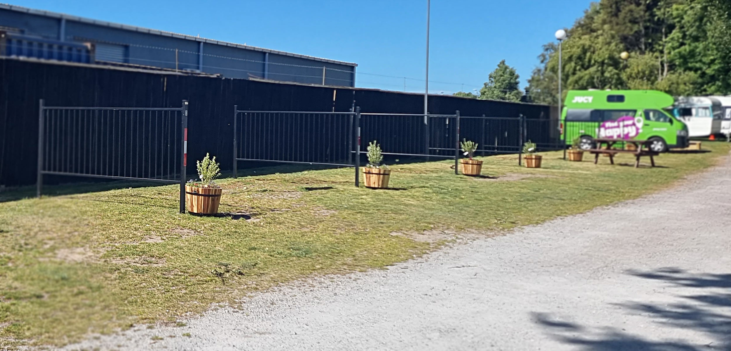 Small grass sites divided by fences. Our sites are set in landscaped grounds with picnic tables and shady trees on hand. Clean and modern communal facilities nearby with free BBQs also. For small tent + car, or small van no longer than 5m.